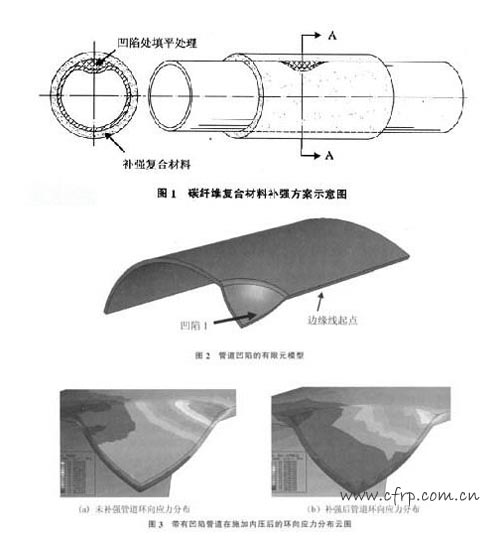 經(jīng)有關(guān)部門研究決定采用碳纖維復(fù)合材料補強技術(shù)對此管道進行搶修。首先使用填平樹脂對凹陷進行填平修復(fù)處理,然后纏繞高強度碳纖維復(fù)合料(見圖1)。
