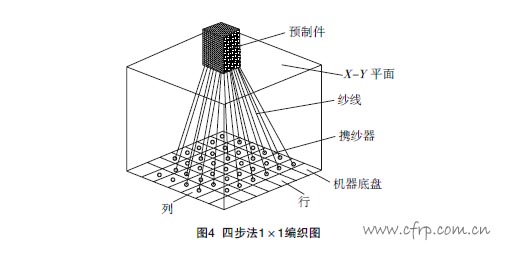 近年來,許多學(xué)者對矩形編織材料細(xì)觀結(jié)構(gòu)給予了高度的關(guān)注,逐步建立了由簡單“米”字型到三維實(shí)體的單胞幾何模型,推動著力學(xué)模型的發(fā)展。鄭錫濤和葉天麒[13]系統(tǒng)地研究了四步法1×1方型編織工藝編制的預(yù)成形件及其增強(qiáng)的復(fù)合材料的細(xì)觀結(jié)構(gòu)。提出了紗線橢圓形橫截面假設(shè),考慮了編織紗線的細(xì)度和編織紗線填充因子的影響,創(chuàng)建了正軸模型。根據(jù)編織過程中攜紗器的運(yùn)動軌跡特點(diǎn),將預(yù)成形件劃分為三個不同的區(qū)域,分別定義了不同的控制體積單元,識別了編織結(jié)構(gòu)參數(shù)之間的關(guān)系,同時給出三維編織復(fù)合材料的設(shè)計方法,三維編織示意圖見圖4。馮偉和馬文鎖[14]將編織物中連續(xù)的紗線離散開來并用特殊的點(diǎn)符號表達(dá),用點(diǎn)群和空間群分析現(xiàn)有編織材料幾何結(jié)構(gòu),一方面可以合理地對現(xiàn)有編織材料幾何結(jié)構(gòu)進(jìn)行描述和分類;另一方面也可以將該理論用于推導(dǎo)編織材料幾何結(jié)構(gòu)新的和更為有效的編織方法。張美忠等[15]由于編織復(fù)合材料實(shí)際結(jié)構(gòu)的復(fù)雜性,為了使研究結(jié)果更真實(shí),用現(xiàn)有成熟的有限元軟件仿真三維編織復(fù)合材料,并研究其各項(xiàng)力學(xué)性能已成為一種趨勢。