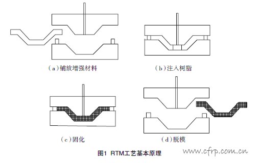 RTM成型工藝是先在模腔內(nèi)預(yù)先鋪放增強(qiáng)材料預(yù)成形體,芯材和預(yù)埋件,然后在壓力或真空作用力下將樹脂注入閉合模腔,浸潤纖維,固化后脫模,再進(jìn)行二次加工等后處理工序,其基本原理如圖1所示。