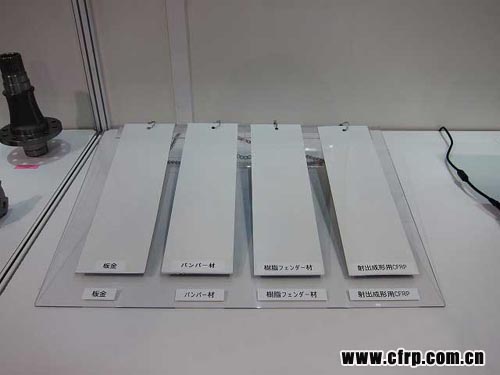圖:碳纖維強(qiáng)化PP的成形樣品 最右邊寫(xiě)著“射出成形用CFRP”的是在碳纖維強(qiáng)化PP成形品上涂了白漆的樣品。從左邊起依次是鋼板、保險(xiǎn)杠用PP成形品、在擋泥板用樹(shù)脂成形品上涂了白漆的樣品。