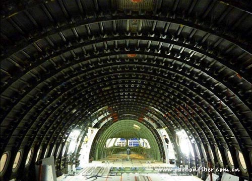 首個A350XWB前機身內(nèi)部構(gòu)造。前機身結(jié)構(gòu)采用碳纖維復(fù)合材料,正在法國圣納澤爾工廠進(jìn)行組裝。