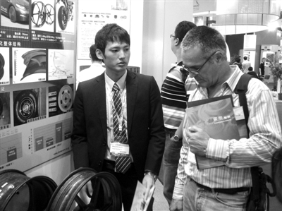 日本東麗公司是全球領先的碳纖維生產(chǎn)商,其產(chǎn)品是不少國內(nèi)外客戶的首選。圖為日前在北京舉行的2010第十六屆中國國際復合材料工業(yè)技術展覽會上,一位美國采購商與東麗公司日本技術人員正洽談碳纖維業(yè)務。 (本報記者 徐巖 攝)