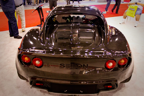 One of our most popular articles ever was on Jimmy Wong’s all raw carbon fiber Lotus Elise. While attending SEMA this year, Seibon, an aftermarket parts manufacturer that specializes in carbon fiber, also had an all carbon fiber Elise in their booth:
