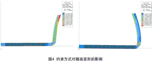 在固化變形分析中,熱膨脹與固化收縮決定了預(yù)浸料應(yīng)變能的水平,而預(yù)浸料的約束方式則直接決定了殘余應(yīng)力在結(jié)構(gòu)上的分布狀態(tài)。殘余應(yīng)力在厚度方向上分布的 不平衡導(dǎo)致了結(jié)構(gòu)的翹曲變形。圖4為采用相同預(yù)浸料,經(jīng)歷相同的溫度歷程,在不同約束方式下的兩個(gè)L型件的變形計(jì)算結(jié)果。左圖L 型件外側(cè)施加全約束,固化結(jié)束后釋放約束;右圖L型件內(nèi)側(cè)施加全約束,固化結(jié)束后釋放約束??梢?jiàn),采用不同的約束方式將顯著影響最終的變形結(jié)果。