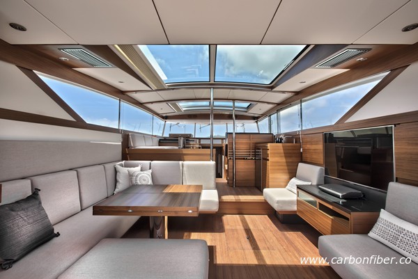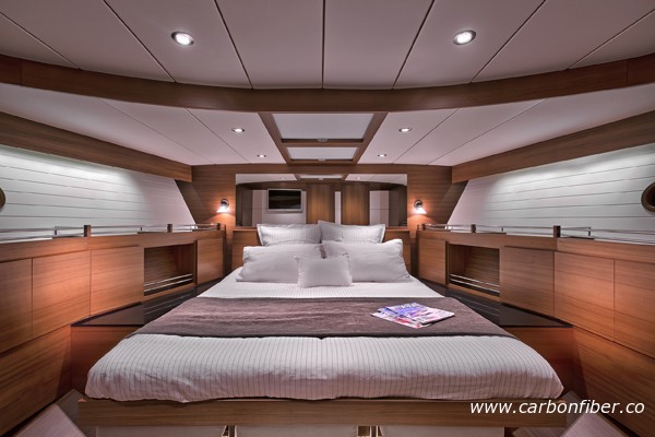 據(jù)了解,目前市場上很多船都標榜“碳纖維”,但事實上大部分都只有小區(qū)域用了碳纖維而其他區(qū)域只是一般的纖維組合。Delta 54 是全球第一艘100%使用碳纖維的游艇,除了船體外,室內(nèi)柜子門、隔艙板及地板等附屬設(shè)施均由碳纖維打造。