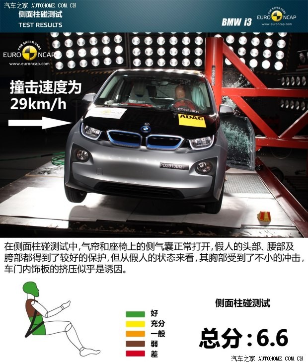 側(cè)面柱碰測試對于寶馬i3來說,不僅是檢驗車輛對駕駛員的保護能力,另一方面,車身結(jié)構(gòu)對平鋪在車底的電池總成的保護也是一個考驗,但遺憾的是,E-NCAP的碰撞試驗沒有對此進行特別的說明,在未來,針對新能源汽車的碰撞測試中,這一環(huán)節(jié)是需要完善的。