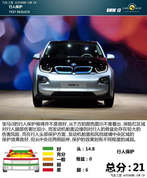 寶馬i3之所只拿到四星的成績,很大程度上都是因為這款車在行人保護和主動安全系統(tǒng)兩項評估失分較多,其中,行人保護測試中針對骨盆的評價和主動安全系統(tǒng)測試中有關(guān)速度輔助系統(tǒng)的評估都沒有得分,這導(dǎo)致兩項測試的得分均只拿到總分的一半。