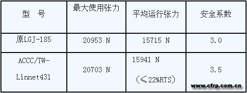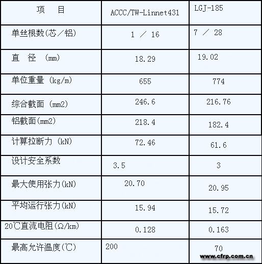 碳纖維復(fù)合芯導(dǎo)線的鋁面積218平方米,大于原LGJ-185導(dǎo)線182.4平方米的鋁面積,載流能力大大增加。下表反映了本次選定的碳纖維復(fù)合芯導(dǎo)線與原導(dǎo)線參數(shù)的對比情況。