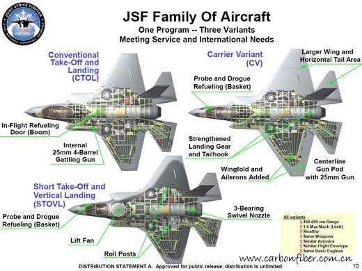 與空對空F-22戰(zhàn)機不同,F(xiàn)-35是一種多用途戰(zhàn)機。將對空對地攻擊基于一身。因此美國飛行員不得不掌握更為先進的駕駛技術。F-35有三個不同的版本:F-35A常規(guī)起降型(CTOL)、F-35B短距起飛垂直降落型(STOVL)以及F-35C艦載型(CV)。這款多用途戰(zhàn)機的強大攻擊力足以取代美軍中的F-16, A-10, AV-8B 和F-18戰(zhàn)機,以及英軍中的the Sea Harrier和GR.7戰(zhàn)機。F-35的出現(xiàn),能夠使美軍目前的F-22和F-18E/F船隊得到有效補充。而從制造業(yè)角度來說,F(xiàn)-35三種版本,其中至少有20%在設計上是相同的。由此降低了項目設計成本。 本文來自123