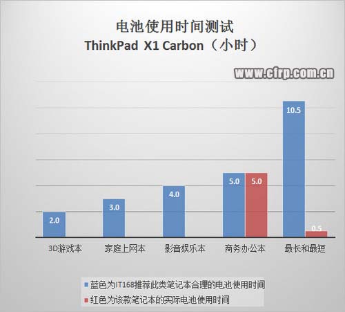 對于超極本來說,英特爾要求所有的超超極本在MobileMark2007電池使用時(shí)間測試中必須超過5小時(shí),而ThinkPad X1 Carbon在屏幕亮度調(diào)整到50%以后,在該項(xiàng)測試中運(yùn)行了301分鐘(5小時(shí)1分鐘),達(dá)到英特爾的要求,基本滿足日常應(yīng)用的需求。