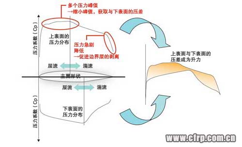 為了防止在馬赫0.7以上的高速區(qū)域發(fā)生衝擊波,需要控制壓力係數(shù)的峰值,但是,為了得到足夠的升力,還需要長(zhǎng)時(shí)間維持大壓力係數(shù)。因此,SHM-1把峰值從一個(gè)增加到了多個(gè)。