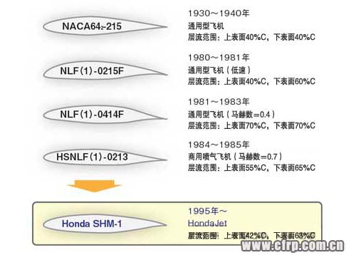自然層流翼型的研究始於1930年代,但由於在高速飛機(jī)中使用時(shí)失速特性差,未能投入實(shí)用。為HondaJet開發(fā)的自然層流翼型「SHM-1」從根本上調(diào)整翼型,解決了過去的課題。