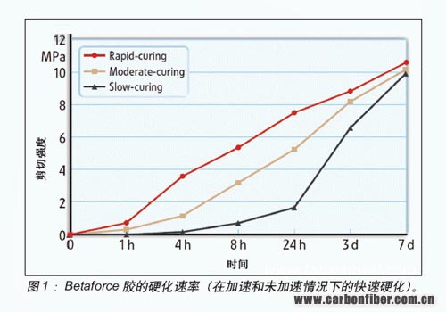 在標(biāo)準(zhǔn)氣候條件下,兩小時(shí)后沒(méi)有達(dá)到該拉伸剪切強(qiáng)度值。但是在加速條件下,1小時(shí)候即測(cè)得了達(dá)3.5MPa。樣本儲(chǔ)存于室溫條件下,強(qiáng)度僅為0.7 MPa。三天后,采用加速膠黏劑,達(dá)到了最終強(qiáng)度10.5MPa,而未經(jīng)加熱反應(yīng)的樣本,在7天后方達(dá)到該強(qiáng)度。