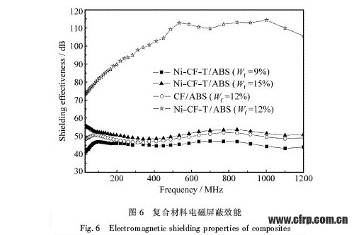其中:μr為材料相對(duì)銅的磁導(dǎo)率;σr為材料相對(duì)銅的電導(dǎo)率;f為電磁波的頻率;t為材料厚度。因此,當(dāng)材料厚度t和入射電磁波頻率f一定時(shí),材料的電磁屏蔽效能主要與σr和μr有關(guān)。纖維表面金屬化后,σr和μr值增大,復(fù)合材料屏蔽效能增加。圖6是復(fù)合材料在30~1200MHz頻率范圍內(nèi)的電磁屏蔽效能曲線。由圖6可以看出,Wf=12%時(shí),CF/ABS的屏蔽值在50dB左右,而Ni-CF-T/ABS的屏蔽值均在73dB以上,最高可達(dá)114dB。在500~1000MHz范圍內(nèi),碳纖維鍍鎳對(duì)電磁屏蔽性能的增強(qiáng)作用尤為顯著,屏蔽值提高60dB??梢?纖維表面金屬化可明顯提高材料的電磁屏蔽性能。同時(shí),110dB的屏蔽值超過國(guó)外同類產(chǎn)品。