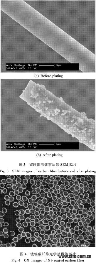 采用SEM對(duì)碳纖維電鍍前后的形貌進(jìn)行觀察;采用光學(xué)顯微鏡對(duì)材料鍍層厚度進(jìn)行觀察;彎曲性能參照GB/T9341-2000,采用CSS-44001電子萬能試驗(yàn)機(jī)測(cè)試;電磁屏蔽效能參照QJ2809-96,由中國(guó)計(jì)量科學(xué)研究院測(cè)定。測(cè)試環(huán)境條件:溫度為22.5℃;濕度為45%(RH);測(cè)試頻率范圍為30~1200MHz。