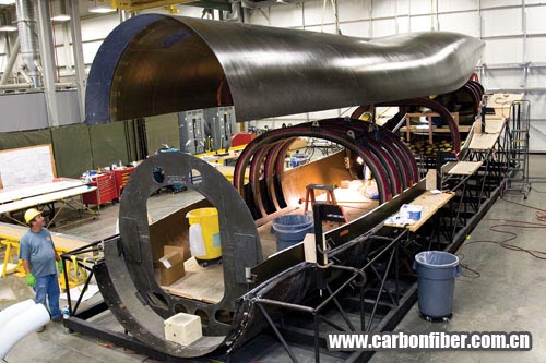 圖3 先進(jìn)復(fù)合材料貨運(yùn)飛機(jī)的機(jī)身由8個(gè)部件組成,它們采用英國(guó)先進(jìn)復(fù)合材料集團(tuán)(ACG)提供的MTM-45預(yù)浸料經(jīng)過(guò)OOA固化制成。圖片來(lái)源:洛克希德馬丁公司