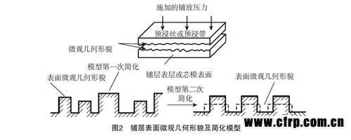 鋪層間緊密接觸度被定義為:在任意給定時(shí)間,兩鋪層接觸面積占鋪層面積總面積的百分比,與溫度、壓力、接觸時(shí)間有關(guān)[17]。由于表面粗糙度的原因,預(yù)浸絲或預(yù)浸帶表面與鋪層表面(或芯模表面)的微觀幾何形貌為不規(guī)則體,在未加熱和未施加壓力的條件下,預(yù)浸絲或預(yù)浸帶表面與鋪層表面(或芯模表面)不可能完全接觸。為理論計(jì)算方便,國(guó)外研究人員首先將不規(guī)則的微觀幾何體簡(jiǎn)化成大小不同的矩形(指截面),然后再將上述矩形簡(jiǎn)化成大小相同的矩形[18-20]。纖維鋪放過程中,在加熱到一定溫度時(shí),當(dāng)壓輥對(duì)預(yù)浸絲或預(yù)浸帶施加一定的鋪放壓力后,預(yù)浸絲或預(yù)浸帶與鋪層表面(或芯模表面)的突起的矩形將發(fā)生變形,矩形高度將減小,寬度將增大,然后根據(jù)這一模型,建立計(jì)算鋪放壓力與鋪層間緊密接觸度之間的函數(shù)關(guān)系。將現(xiàn)行的粗糙度評(píng)價(jià)指標(biāo)融入上述計(jì)算模型中,可顯著提高實(shí)際應(yīng)用的方便程度。圖2為鋪層表面微觀幾何形貌及簡(jiǎn)化模型示意圖。