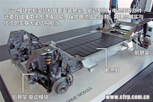 寶馬i系列車型采用了“LifeDrive”模塊架構(gòu),它由“Life”和“Drive”兩個(gè)獨(dú)立的模塊組成,“Life”代表乘員艙部分,采用超輕量化并且高強(qiáng)度的CFRP碳纖維復(fù)合材料構(gòu)成,而“Drive”則將懸架、蓄電池組、驅(qū)動(dòng)系統(tǒng)和碰撞防護(hù)結(jié)構(gòu)納入整個(gè)模塊中。仔細(xì)看就會(huì)發(fā)現(xiàn),這種結(jié)構(gòu)的理念其實(shí)與傳統(tǒng)的非承載車身相似,不過高強(qiáng)度的復(fù)合碳纖維乘員艙是那些傳統(tǒng)非承載車身的車廂所望塵莫及的。