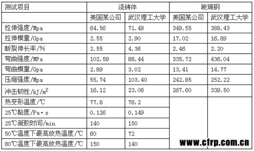 6.2 為改善工藝性,建議采用武漢理工大學(xué)材料學(xué)院復(fù)合材料系研發(fā)的高性能低黏度環(huán)氧樹脂。其已開發(fā)的樹脂玻璃化溫度(Tg)達(dá)190℃,黏度可低到80mPa•s,浸漬性大為提高。下面是武漢理工大學(xué)與美國某公司環(huán)氧樹脂實(shí)物的測試結(jié)果,可資比較參考。