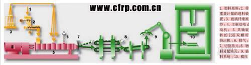 目前,在線LFT工藝主要分為LFT擠出模壓和LFT在線混煉注塑兩種。LFT擠出模壓技術(shù)最具代表性的是Dieffenbacher公司的LFT-D-ILC(Long Fiber reinforced Thermoplastics - Direct processing - In Line Compounding)技術(shù)。其工藝設備布置如圖1所示。 123,123