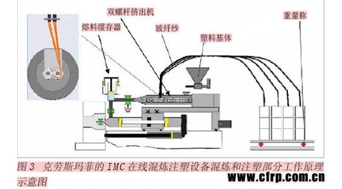 克勞斯瑪菲公司開發(fā)的在線配混注塑成型設備(其工作原理如圖3所示)為LFT工藝的實現(xiàn)提供了一種新的方法。該設備將雙螺桿混煉機和克勞斯瑪菲的標準MC塑料注塑機組合,實現(xiàn)了原料在線直接混煉。這種混煉-注塑方法具有更多優(yōu)勢: