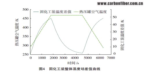 本文以柱支撐形式建立大型復(fù)合材料固化工裝模型,在保證工裝結(jié)構(gòu)靜力剛度的前提下,計(jì)算得到工裝在熱壓罐固化工藝過(guò)程中的溫度場(chǎng)分布,然后把重力載荷,施加到帶有溫度值的有限元模型上進(jìn)行工裝的熱- 結(jié)構(gòu)耦合分析。得到結(jié)論如下:
