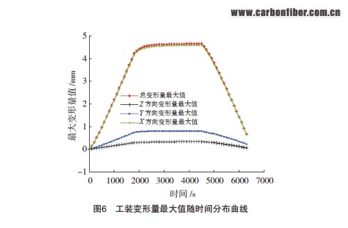 復(fù)合材料在熱壓罐中固化分為3個(gè)熱歷程:升溫、恒溫和降溫,此過(guò)程中工裝溫度場(chǎng)分布的不均勻性導(dǎo)致各部分熱應(yīng)力分布不均勻,工裝在熱應(yīng)力和自重載荷耦合作用下產(chǎn)生變形。熱歷程中工裝變形量最大值分布如圖6所示,從圖中可得出: