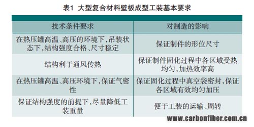 工裝是復(fù)合材料制件的成型基礎(chǔ),工裝既要保證復(fù)合材料制件的形位尺寸,同時(shí)又要充分適應(yīng)復(fù)合材料制件的成型工藝特點(diǎn)——傳熱、傳壓等,所以工裝技術(shù)是復(fù)合材料研制的關(guān)鍵因素,復(fù)材成型工裝基本要求如表1所示。