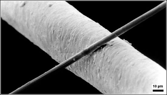 直徑6微米的碳纖維與后面人類頭發(fā)的比較