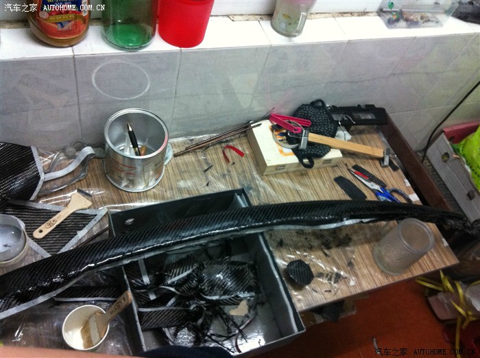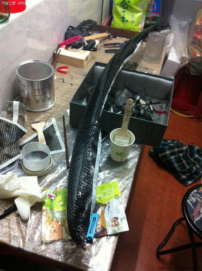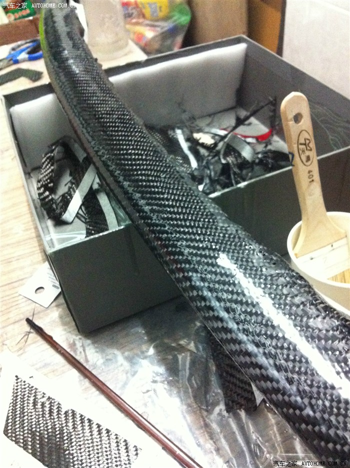 “車禍現(xiàn)場(chǎng)”兄弟,請(qǐng)看下面的幾個(gè)照片,尾翼制作過程中,包的雙層碳纖維,樹脂要刷好幾遍呢,這是第二層的第二遍,預(yù)計(jì)還要一周時(shí)間。